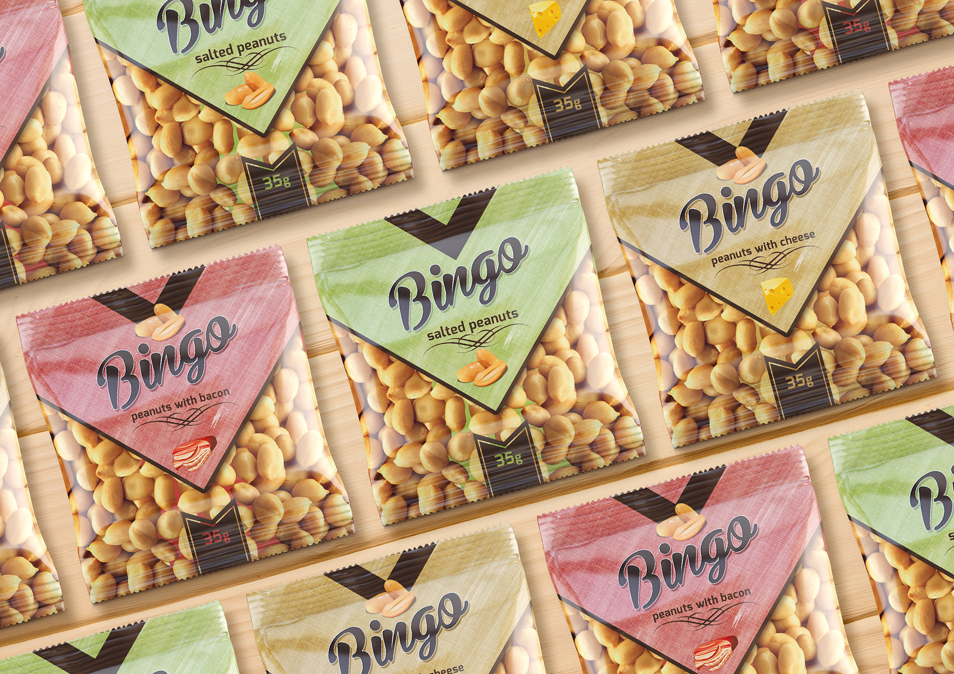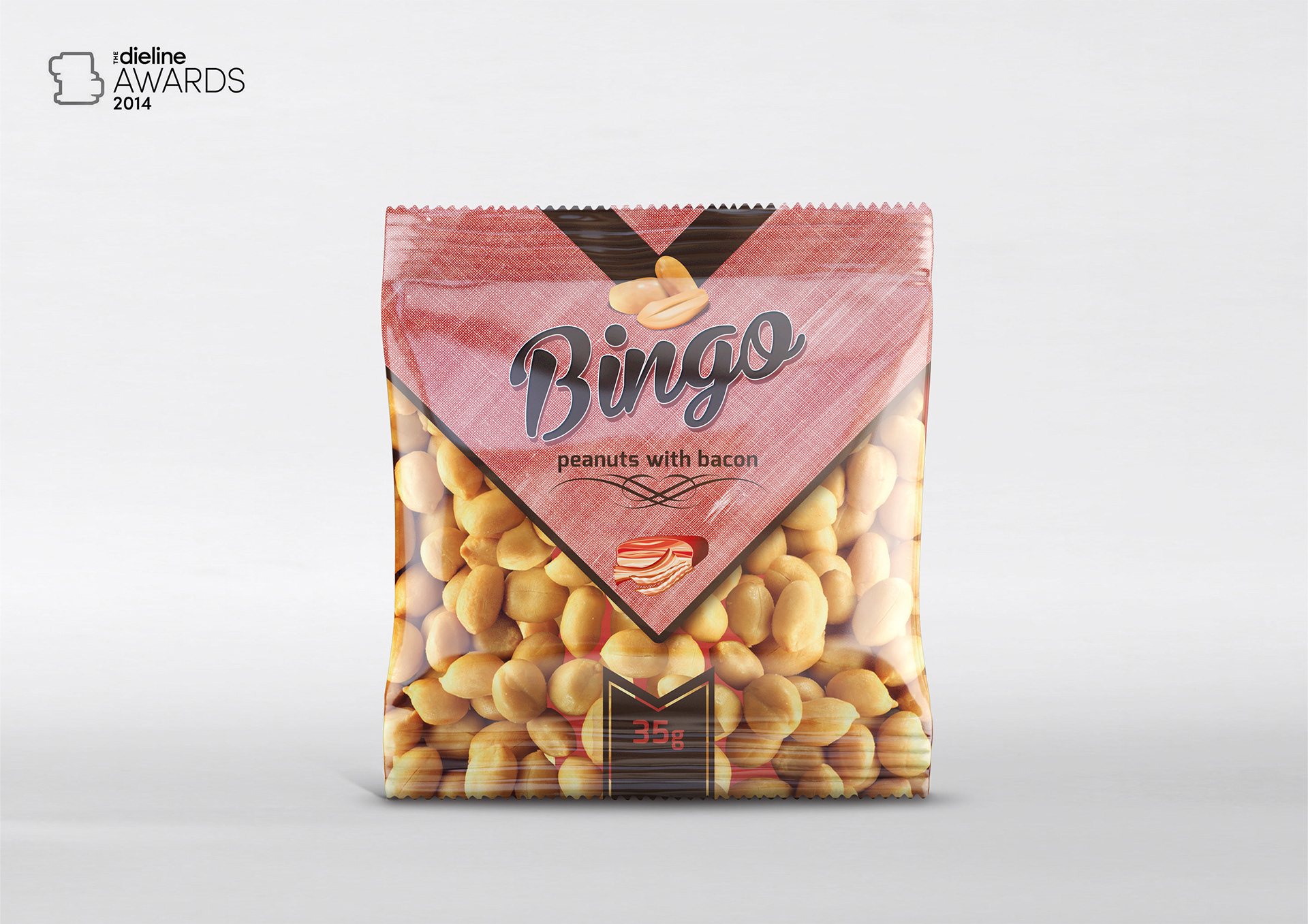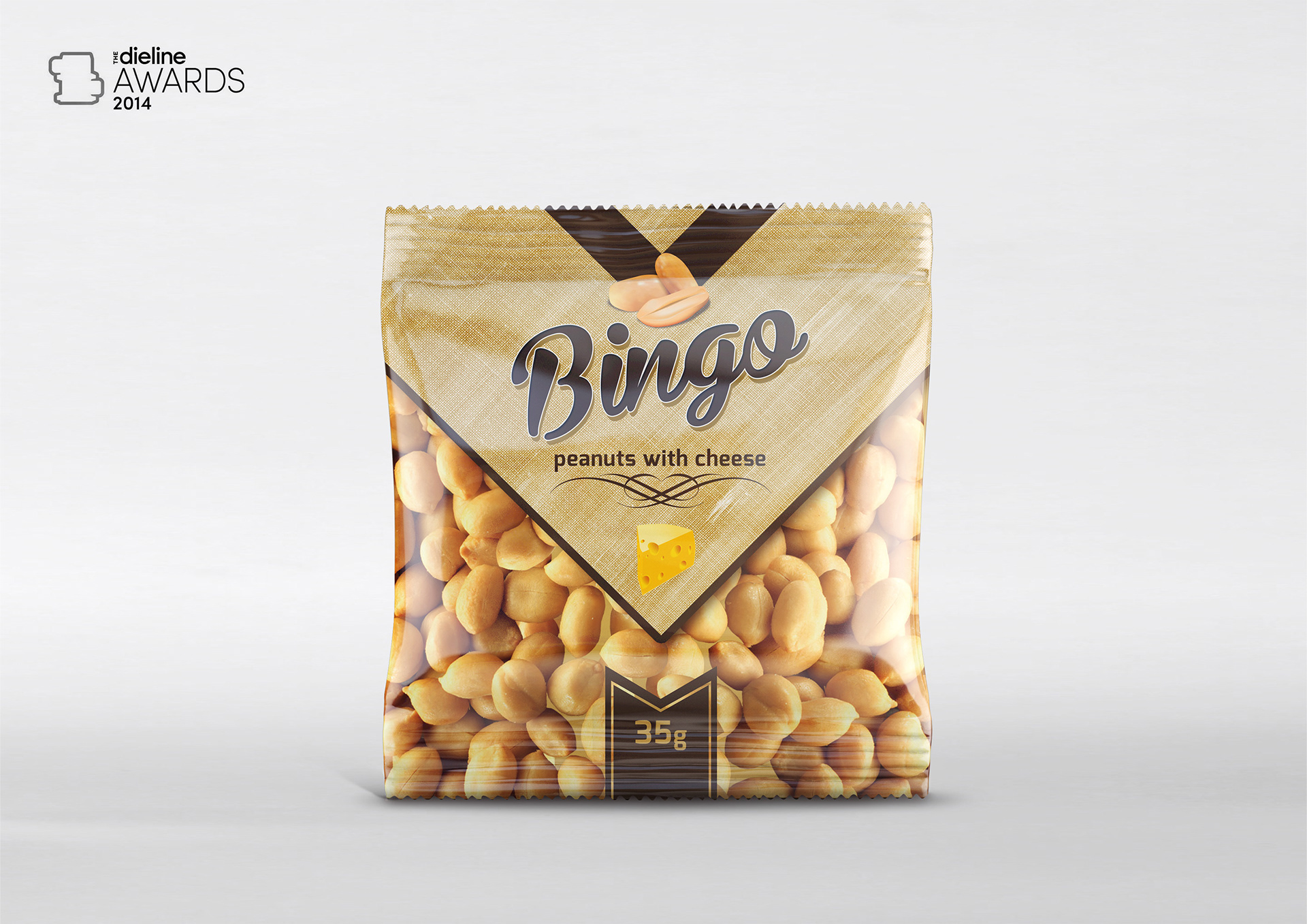Peanuts are an underrated snack. With that in mind, Dima Rykov wanted to create packaging for this small nut to help it stand out on supermarket shelves. Three flavored peanut snacks are bagged in plastic pouches and assigned a color to help differentiate one from another. The brand's name, "Bingo", is casual written across the bag in script alongside an arrow pointing downward towards the photograph of a bundle of peanuts. Country: Ukraine 2014